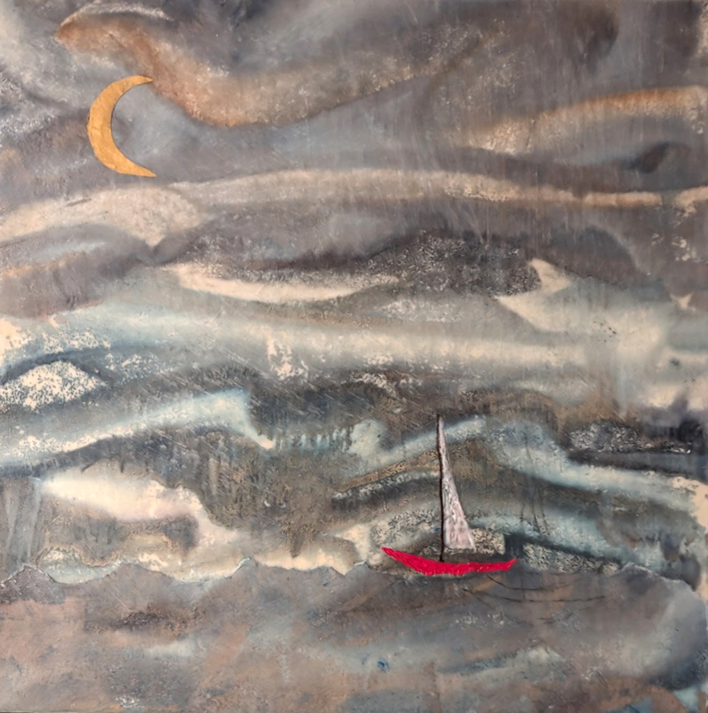 Works include inks, pastels, watercolor, oils, original photographs and found objects all layered and encased in wax.